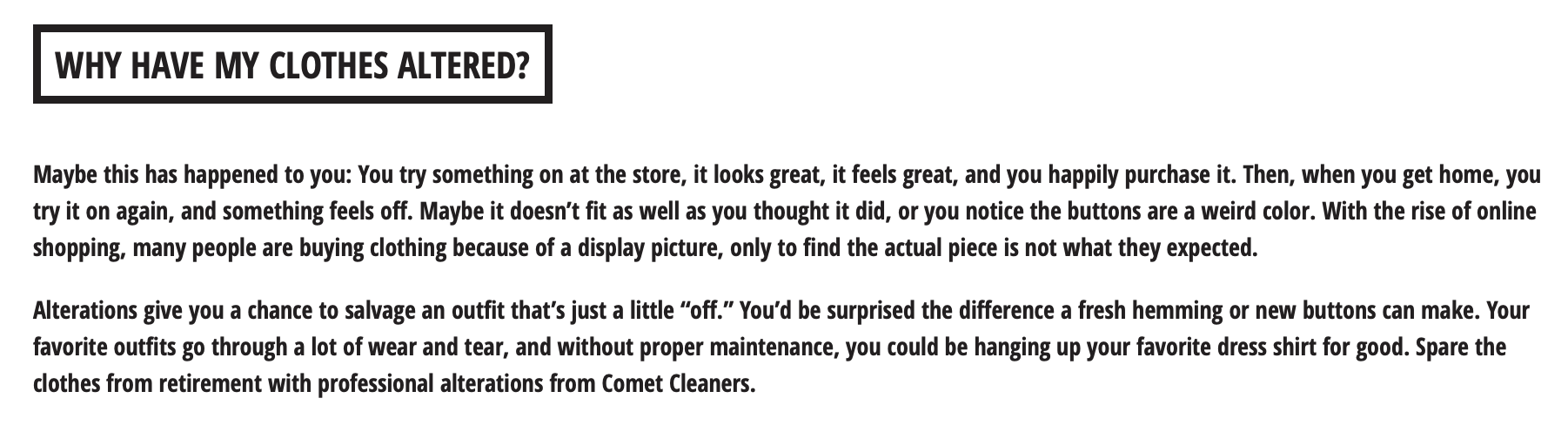 Alterations give you a chance to salvage an outfit that’s just a little “off.” You’d be surprised the difference a fresh hemming or new buttons can make. Your favorite outfits go through a lot of wear and tear, and without proper maintenance, you could be hanging up your favorite dress shirt for good. Spare the clothes from retirement with professional alterations from Comet Cleaners.