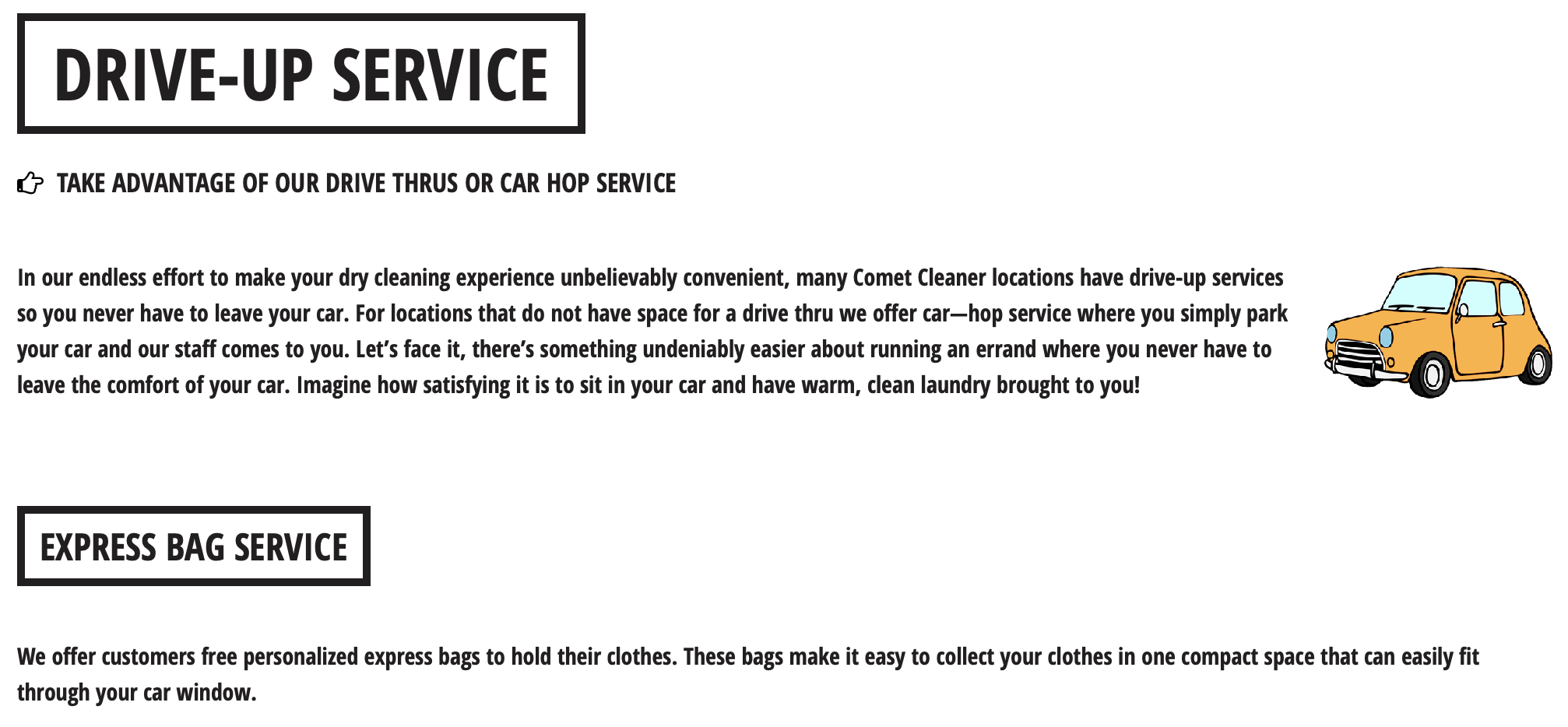 In our endless effort to make your dry cleaning experience unbelievably convenient, many Comet Cleaner locations have drive-up services so you never have to leave your car. For locations that do not have space for a drive thru we offer car—hop service where you simply park your car and our staff comes to you. Let’s face it, there’s something undeniably easier about running an errand where you never have to leave the comfort of your car. Imagine how satisfying it is to sit in your car and have warm, clean laundry brought to you!
